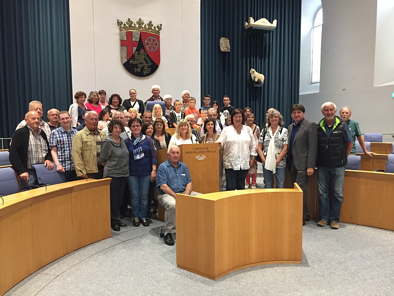 Im Rahmen des Partnerschaftstreffens Alzey-Weinheim und Lembeye fand auch ein Besuch des Landtages in Mainz statt. Landtagsabgeordneter Heiko Sippel (SPD) empfing die Weinheimer mit ihrem Ortsvorsteher Uwe Frey und den Lembeyer Freunden bereits am Bahnhof und begleitete sie in das Regierungs- und Parlamentsviertel. Trotz Parlamentspause machte es Sippel möglich, den übergangsweise im Landesmuseum eingerichteten Plenarsaal zu besichtigen. Gemeinsam mit Ralph Schrader vom Besucherdienst erläuterte Sippel die Abläufe im Landesparlament. Die französischen Gäste zeigten sich sehr interessiert an der Aufgabenverteilung in einem Bundesstaat. Nach dem Gespräch konnten die Besucher das Büro von Heiko Sippel im Abgeordnetenhaus und den Fraktionssitzungssaal besichtigen, ehe es zum Mittagessen in eine Brauereigaststätte und danach zu einer Fahrt mit der Gutenbergbahn durch Mainz ging.