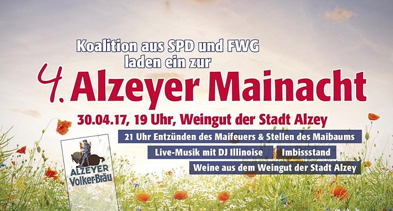Auch in diesem Jahr lädt die Stadtratskoalition von SPD und FWG zum Tanz in den Mai ins Weingut der Stadt Alzey, Schlossgasse 14, ein. Los geht es am Sonntag, dem 30. April, um 19.00 Uhr. DJ Illinoise aus Gau-Odernheim sorgt für die passenden Rhythmen, um ausgiebig das Tanzbein schwingen zu können. Selbstverständlich ist für Speis und Trank einschließlich der beliebten Maibowle ausreichend gesorgt. Gegen 21.00 Uhr wird mit der Entzündung des Maifeuers und der Aufstellung des Maibaumes auch symbolisch die Mainacht eingeläutet. Der Eintritt zur 4. Mainacht ist frei. Die Bevölkerung ist herzlich eingeladen.