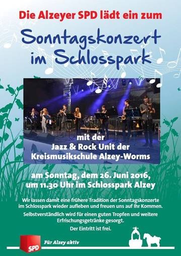 Mit dem Konzert der Jazz and Rock Unit der Kreismusikschule Alzey-Worms lassen die Alzeyer Sozialdemokraten am kommenden Sonntag, 26. Juni, um 11.30 Uhr eine frühere Tradition der Sonntagskonzerte im Alzeyer Schlosspark wieder aufleben. Für einen guten Tropfen (oder mehr…) ist gesorgt. Der Eintritt ist frei.