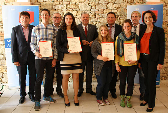 Über ein volles Haus freute sich SPD-Vorsitzende Kathrin Anklam-Trapp, MdL, beim nunmehr elften Bürgerempfang der Sozialdemokraten im Landkreis Alzey-Worms. Neben Ehrengast Kurt Beck, Ministerpräsident a.D. und Vorsitzender der Friedrich-Ebert-Stiftung, Landrat Ernst Walter Görisch, Bundestagsabgeordneter Marcus Held sowie dessen Landtagskollegen Heiko Sippel waren knapp 80 Bürgerinnen und Bürger der Einladung in die Residenz Danz in Alsheim gefolgt. Den Jugend-Aktivpreis überreichten in diesem Jahr Christoph Schmitt gemeinsam mit Ehrengast Kurt Beck an verdiente Jugendliche aus dem Kirchenbereich. Geehrt wurden Jonas Seibert, Julia Feierabend, Melissa Schäfer, Jennifer Fröhlich, Jasmin Gronau und Johanna Seidel. Außerdem erhielt Neumitglied Jana Unselt ihr Parteibuch, überreicht durch Kathrin Anklam-Trapp und Kurt Beck. Umrahmt wurde der Empfang durch musikalische Beiträge des Musikzuges der Freiwilligen Feuerwehr Eich.