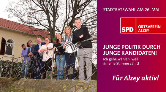 Die jungen Stadtratskandidatinnen und -kandidaten der Alzeyer SPD laden Jungwählerinnen und Jungwähler, die am 26. Mai erstmals in Alzey bei den Kommunal- und Europawahlen wählen dürfen, zu einem Treffen in lockerer Atmosphäre ein. Es findet statt am Samstag, dem 27. April, ab 19.30 Uhr im Café & Bar Lio Alzey, Hospitalstraße 26a. „Es ist uns ein großes Anliegen, Erstwähler kennen zu lernen und mit ihnen ins Gespräch zu kommen, um ganz ungezwungen über deren Ideen, Wünsche, Anregungen und Probleme zu reden. Gerne beantworten wir auch Fragen und nehmen die Anregungen für unsere politische Arbeit mit“, stellen die SPD-Fraktionsvorsitzende Stephanie Jung und Juso-Vorsitzender Chris Wilhelm fest. Eine Anmeldung ist nicht erforderlich. Rückfragen können gerne an chris.wilhelm@spd-alzey.de oder an stephanie.jung@spd-alzey.de gemailt werden.